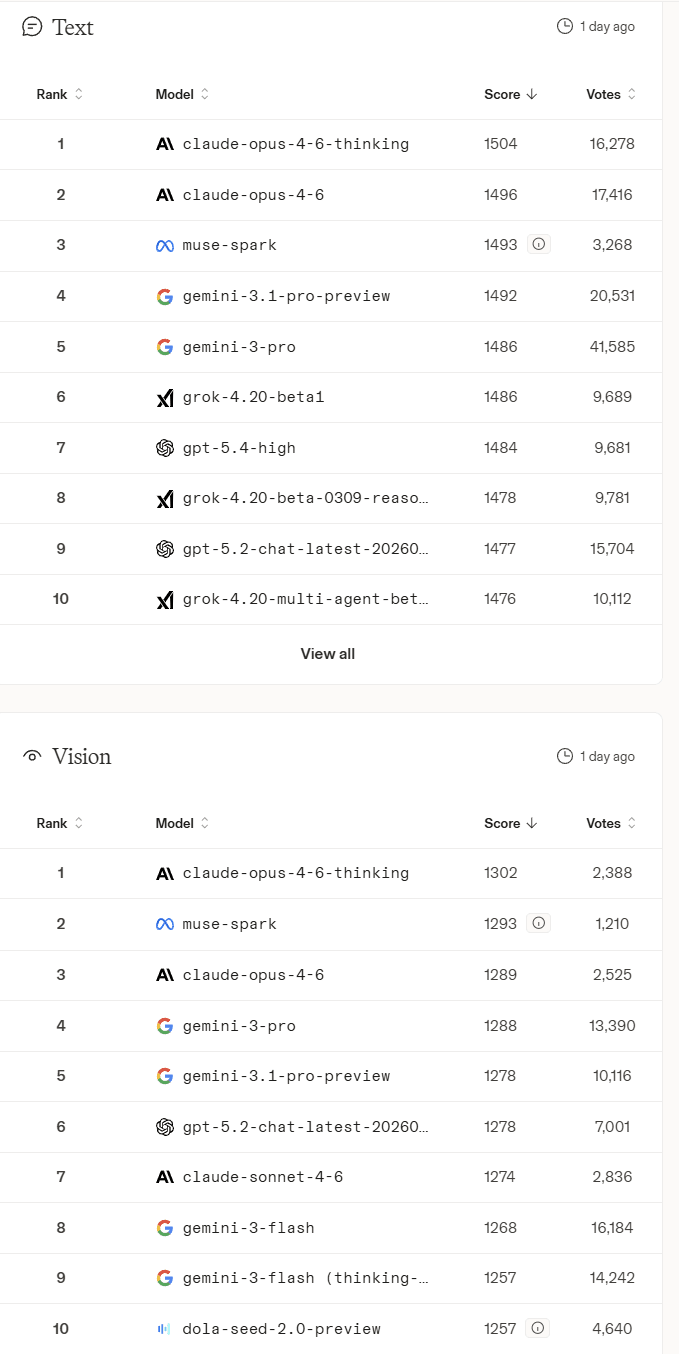 在 Llama 4 惨败之后,经过近 9 个月的 Meta 超级智能团队 (MSL) 重建,Meta 终于发布了新模型:Muse Spark!就在一个月前,《纽约时报》曾对Meta 开发这款前沿模型的努力持相当负面的态度,并声称 Meta 将推迟模型发布至 5 月。然而,Meta 提前一个月发布了模型,这让投资者们惊喜不已。或许更令人欣喜的是,这款模型的表现相当出色。在 Arena(原 LMArena)的排行榜上,Muse Spark 目前在文本和视觉方面仅次于 Claude 4.6,但在编码等其他方面仍存在显著差距。不过,考虑到 Meta AI 的目标用户群体是消费者,编码可能并非其最擅长的应用场景。