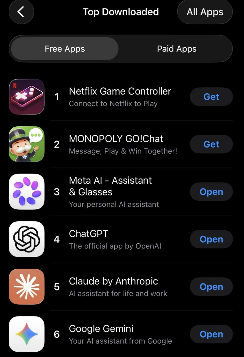 当然,关于“刷分”确实存在一些合理的担忧,这意味着 Meta 重返模型竞争的最可靠标志或许来自应用商店排名。截至撰稿时,Meta AI 在 iOS 应用商店的排名实际上领先于所有其他 AI 应用。