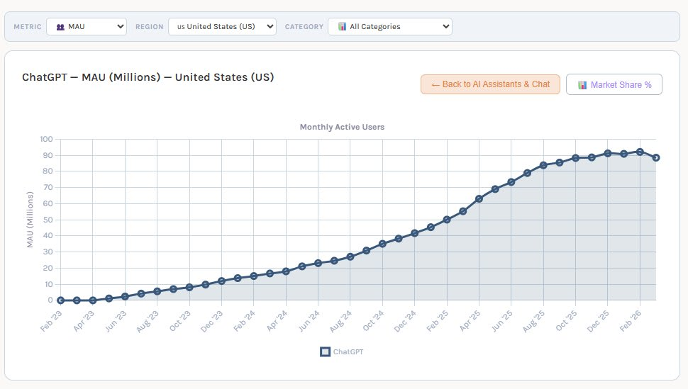 OpenAI 最容易获取用户的时期实际上已经过去。由于网络效应并不明显,获取下一个 5 亿 WAU 的成本很可能远高于获取前 5 亿 WAU。与此同时,谷歌和 Meta AI 的用户质量和速率很可能已经超过了 ChatGPT 为免费用户提供的水平。这无疑是一项艰巨的任务,尤其是在计算资源受限的情况下,OpenAI 还要与 Anthropic 争夺利润丰厚的企业级用户!ChatGPT 在美国的月活跃用户数 (MAU) 在过去六个月基本持平,这很可能强烈表明,面对 Gemini 3.0(以及后来的 Claude)的竞争,ChatGPT 维持 WAU 增长已经非常困难。如果 Meta AI 能在今年剩余的时间里保持目前的发布节奏,这将对 OpenAI 的 WAU 增长目标造成巨大冲击。