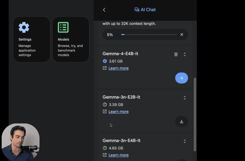 从 App Store/ Google Play下载Google AI Edge Gallery,打开它,点击AI Chat,然后从选项中下载一个模型;我们下载的是 Gemma 4 E2B (2.5 GB)。