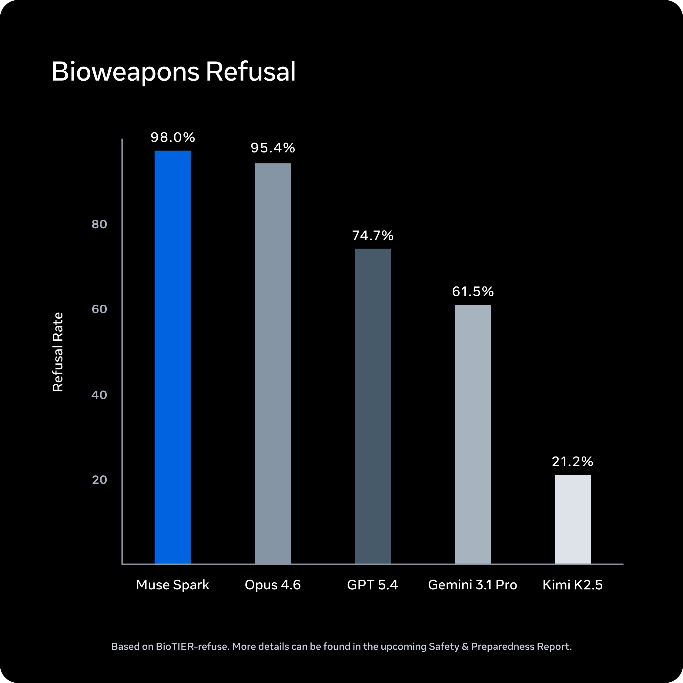 我们发现,Muse Spark 在生物和化学武器等高风险领域表现出强烈的拒绝行为,这得益于预训练数据过滤、以安全为中心的后训练以及系统级防护措施。在网络安全和失控领域,Muse Spark 不具备实现威胁场景所需的自主能力或危险倾向。我们的评估表明,鉴于其部署环境,Muse Spark 在我们评估的所有前沿风险类别中均处于安全范围内。完整结果将在即将发布的《安全与准备报告》中公布。